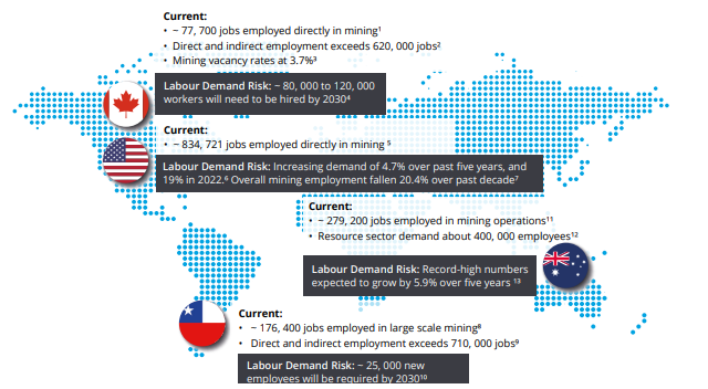 Overall mining employment has fallen 20.4% over the past decade in the United States. In Canada, 80,000 to 120,000 workers will need to be hired by 2030.