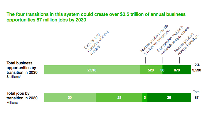 When it comes to mining and power generation, the authors said that nature-positive business  —those that add value to nature — could generate an estimated $3.5 trillion worth of annual value and create 87 million jobs by 2030.