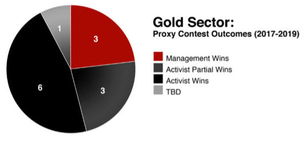 In Q4 2018 and Q1 2019 there were over C$20 billion ($15 billion) in deals announced in the gold industry involving Canadian listed companies and 13 activist campaigns in the last 26 months, the report reads. Activists scored wins or partial wins in all but three contests. Kingsdale notes specifically that the three management wins all came at small companies while the activist wins came at relatively large companies, demonstrating that size is not a defence.