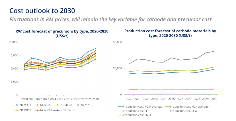 Wu says raw material costs are the main variable for cathode and precursor manufacturing costs and prices are expected to continue to rise from multi-year lows struck last year by an average of 35% by 2030, driven mainly by nickel and cobalt.