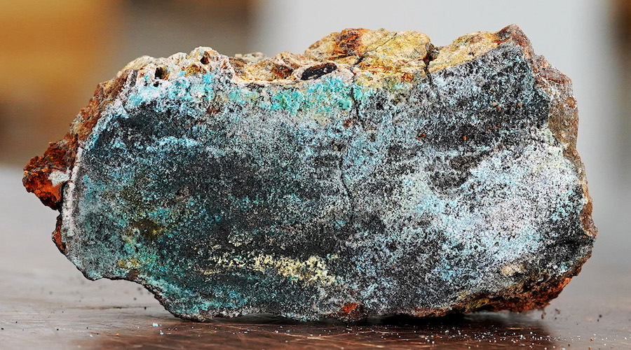 A section of a sulphide sample, obtained during the Norwegian Offshore Directorate’s expedition to the Mohns Ridge in the Norwegian Sea in 2020. (Image: Øystein Leiknes Nag, Norwegian Offshore Directorate.)