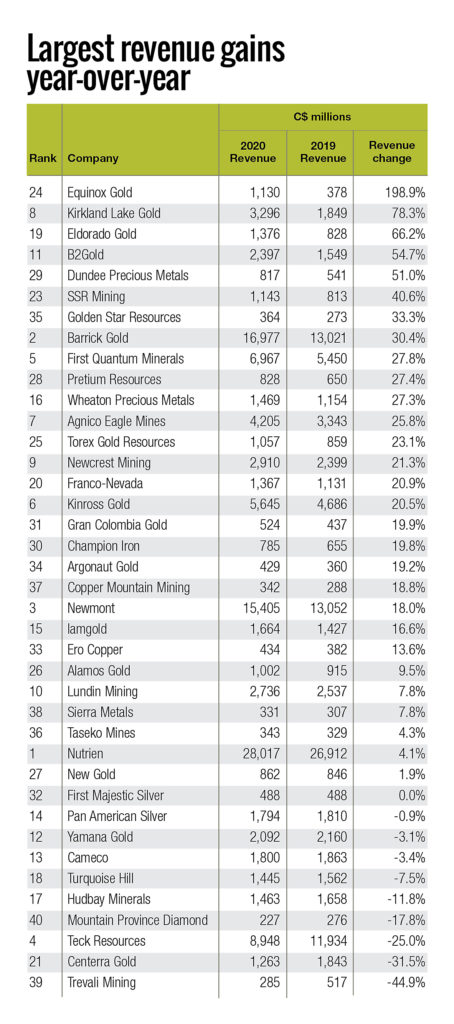 After Nutrien, the Top 40 are dominated by gold and copper miners. More than half of this year’s list – 23 companies – are primary gold miners. Three are copper-gold miners and nine primary copper miners. Together, they account for 87.5% of Canada’s biggest revenue-generating miners. Both gold and copper were winners overall last year, which saw the covid-19 pandemic begin in earnest in March 2020. The gold price spiked above $2,000 per oz. last August, driven by uncertainty around the pandemic and waves of stimulus spending globally. And while copper sunk to just above $2 per lb. last March, it soared to $3.50 by the end of the year and has hit $4.70 in 2021 – boding well for copper miners in next year’s Top 40.