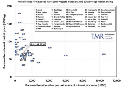 TCMR: You also produce a value metrics chart that maps the value of in-situ rare-earth oxides (REOs) per unit of mineral resources against the average value per unit of the finished, separated REOs. How might this chart help an investor make decisions about what projects will be economic in the long run?