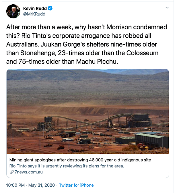 Former Prime Minister Kevin Rudd, the country’s first leader to apologize to generations of Aboriginal and Torres Strait Islander children forcefully taken from their parents by white Australians last century, said Rio Tinto’s “corporate arrogance had robbed all Australians.”