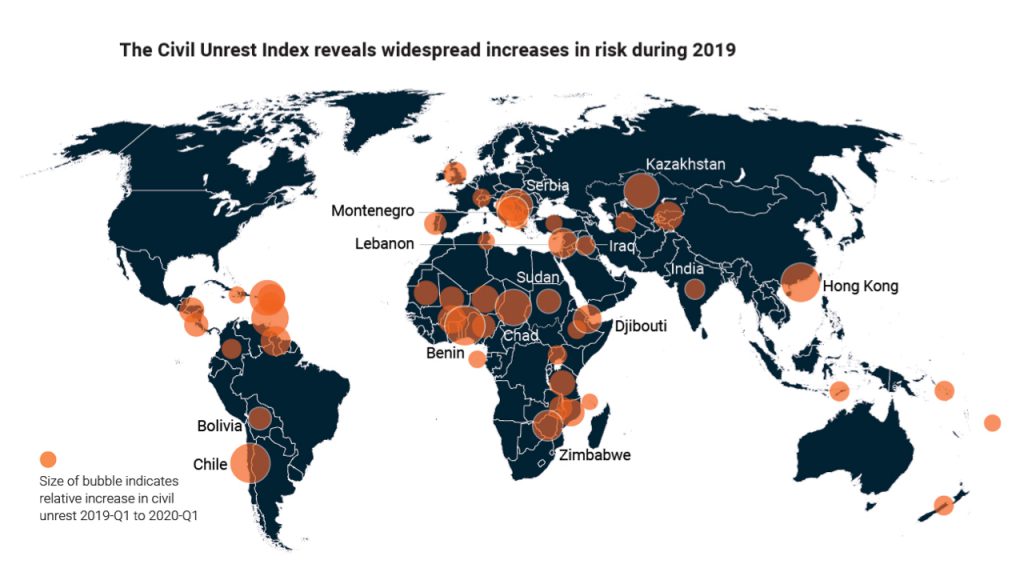 As a result, the number of extremely risky countries in the Civil Unrest Index jumped by 66.7%; from 12 in 2019 to 20 by early 2020.