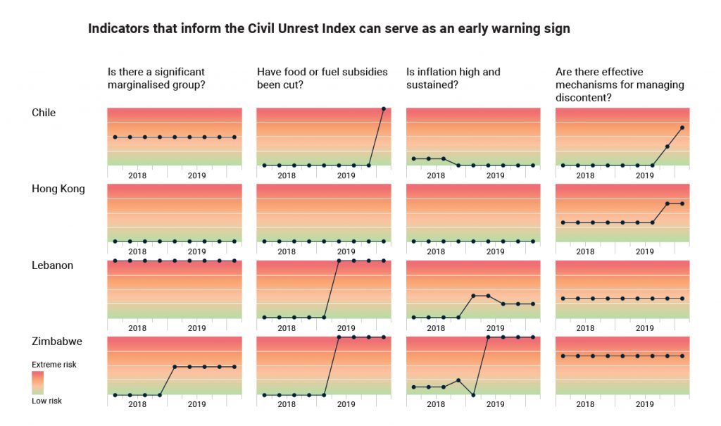 The consultancy detected that a deterioration in some risk factors could serve as an early warning sign in certain jurisdictions. Out of the 11 elements considered in the Civil Unrest Index, subsidy cuts were the single biggest indicator that the risk of civil unrest was growing in Chile, Lebanon and Zimbabwe.