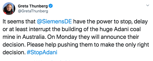 Swedish climate activist, Greta Thunberg, said last week that Siemens had “the power to stop, delay or at least interrupt the building of the huge Adani coalmine in Australia” and people should push the company “to make the only right decision.”