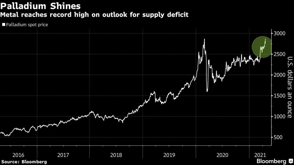Spot palladium jumped as much as 4.7% during the session to $2,899.50 per ounce, surpassing the previous record set in February 2020. Prices have climbed more than 17% in 2021, building on five straight annual gains.