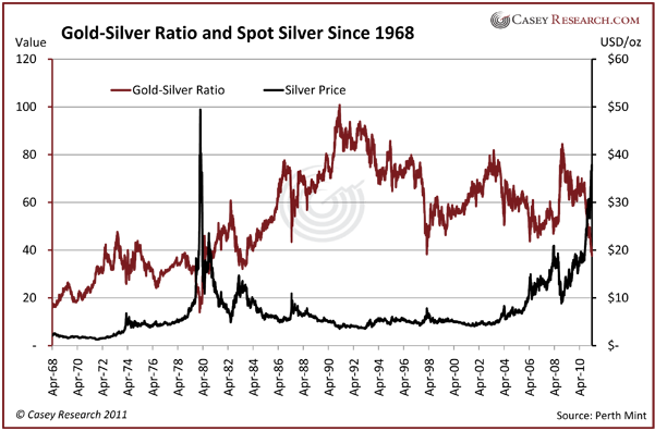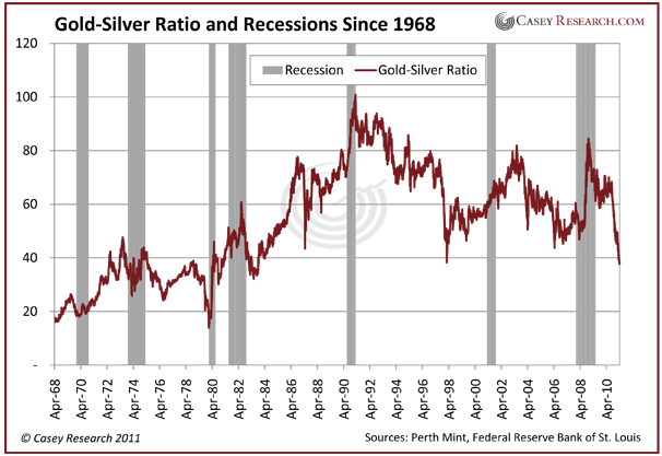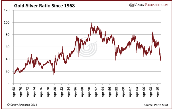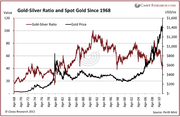 Ed. Note: Since this article was first drafted, there has been a significant correction in gold and silver that has affected the GSR. As of May 12, it stands at 45.8, having increased as predicted in this article.