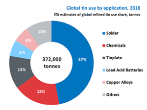 Solder accounts for by far the largest global share of tin use, growing by 2% in 2018. Forecasts for 2019, both inside and out of China, are significantly more negative because of weakening global manufacturing and supply chain issues, mainly linked with the US-China trade war. Electronics miniaturisation remains the greatest medium-term threat, primarily in China, but this will be countered by growth in new markets including 5G communications and electric vehicles, the ITA says.