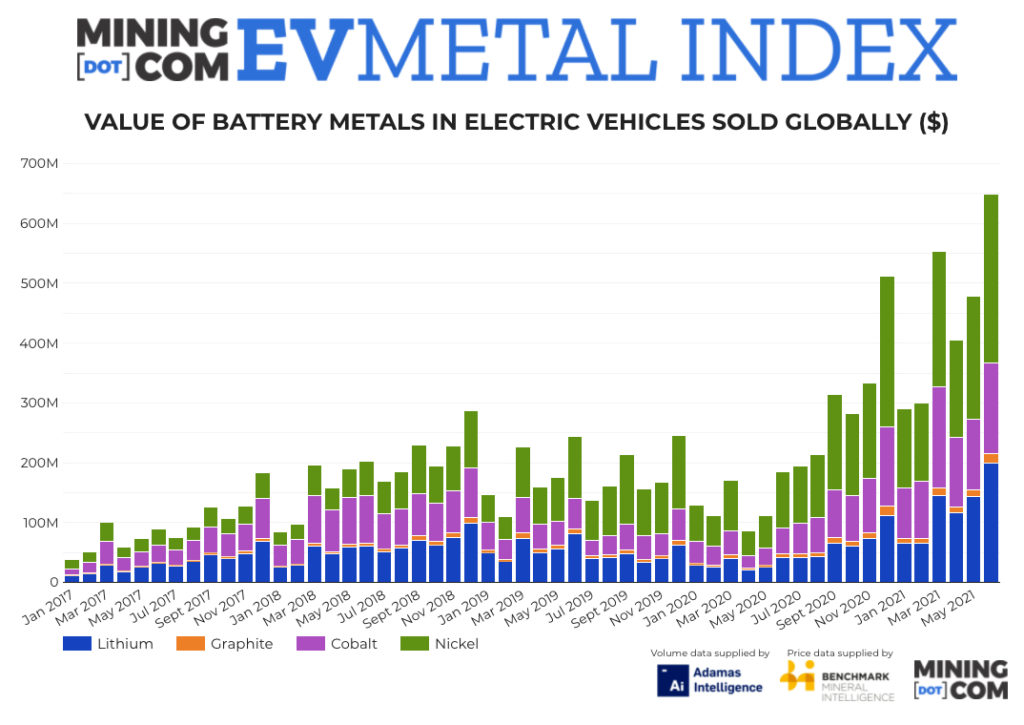 MINING.COM’s EV Metal Index set a new monthly record in June despite seasonal factors, jumping 36% in value from the previous month to edge past December 2020’s record tally.