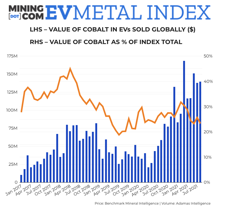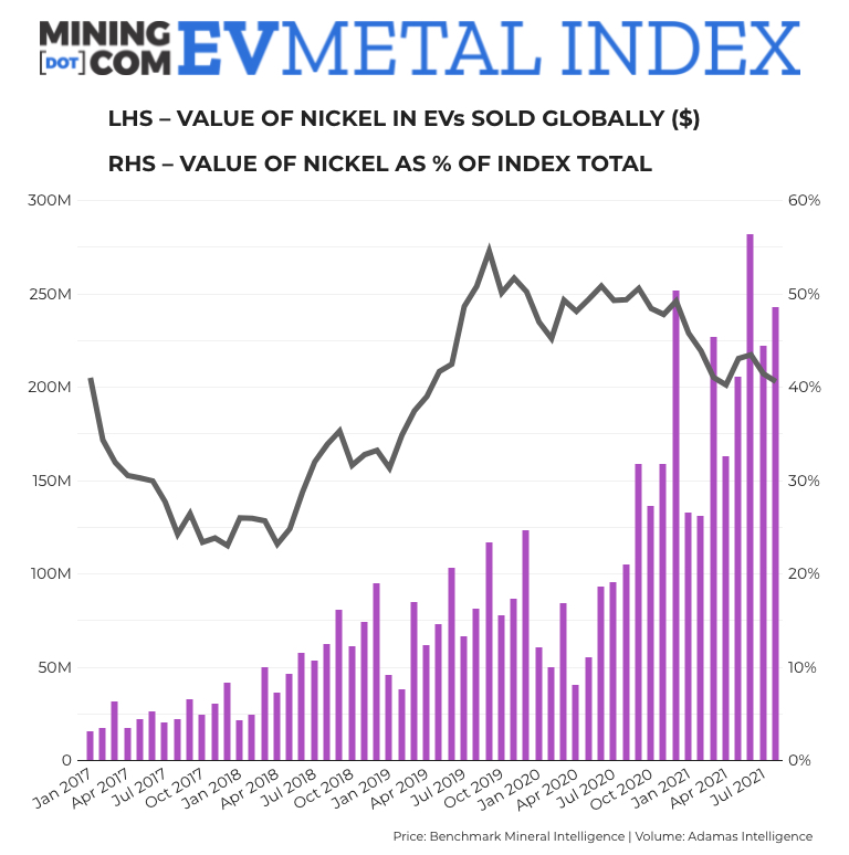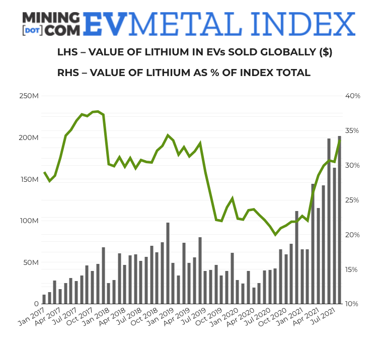 The EV Metal Index, which tracks the value of battery metals in newly registered passenger EVs (including hybrids) around the world, totalled $599.6 million in August, an increase of 180% over the same month last year, bringing year to date total to $3.81 billion.