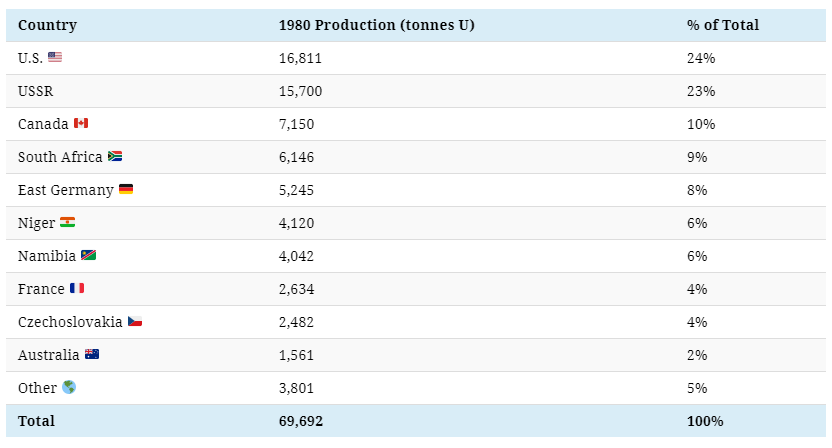 Between 1960 and 1980, global uranium production increased by 53% to reach an all-time high of 69,692 tonnes. Here’s a breakdown of the top uranium producers in 1980:
