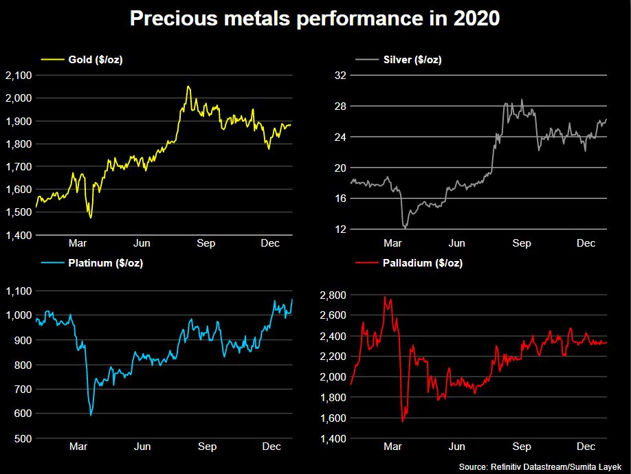 The pandemic triggered stockpiling by investors looking to protect their wealth. This, alongside supply deficits, pushed gold and palladium prices up by more than 20% this year, while silver rose 47%, and platinum 10%. “We are going to see new record highs for gold and palladium (in 2021),” said Philip Newman at consultants Metals Focus.