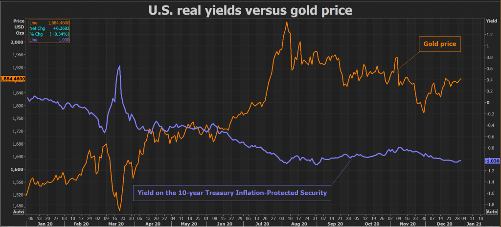 Huge government debt, negative real returns on bonds and threats of inflation and market turbulence, all of which support gold, will persist in 2021, said Ross Norman, an independent analyst. Gold could rise another 20% next year, he said.