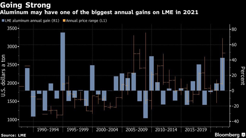 The latest output cuts come soon after curbs at Europe’s top smelter, highlighting supply risk into next year and beyond as the energy-intensive industry faces higher costs and more climate regulation. Citigroup Inc. and Goldman Sachs Group Inc. are among banks that forecast a deeper deficit in 2022. Prices in London are up more than 40% this year.