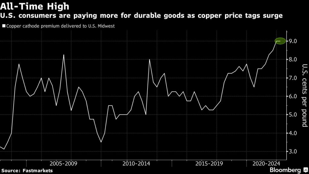 Buyers typically pay a premium over prices on the Comex bourse to have copper delivered to the U.S. Midwest. That cost surged to a record high of 9 cents a pound, according to Fastmarkets that goes back to 2003. That’s 20% higher than the level before the pandemic.
