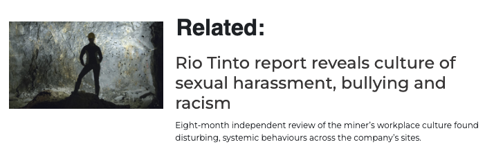 Rio published its own report in February which found that nearly 30% of women had experienced sexual harassment at work, with 21 women reporting actual or attempted rape or sexual assault.