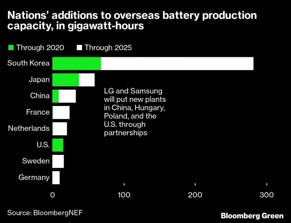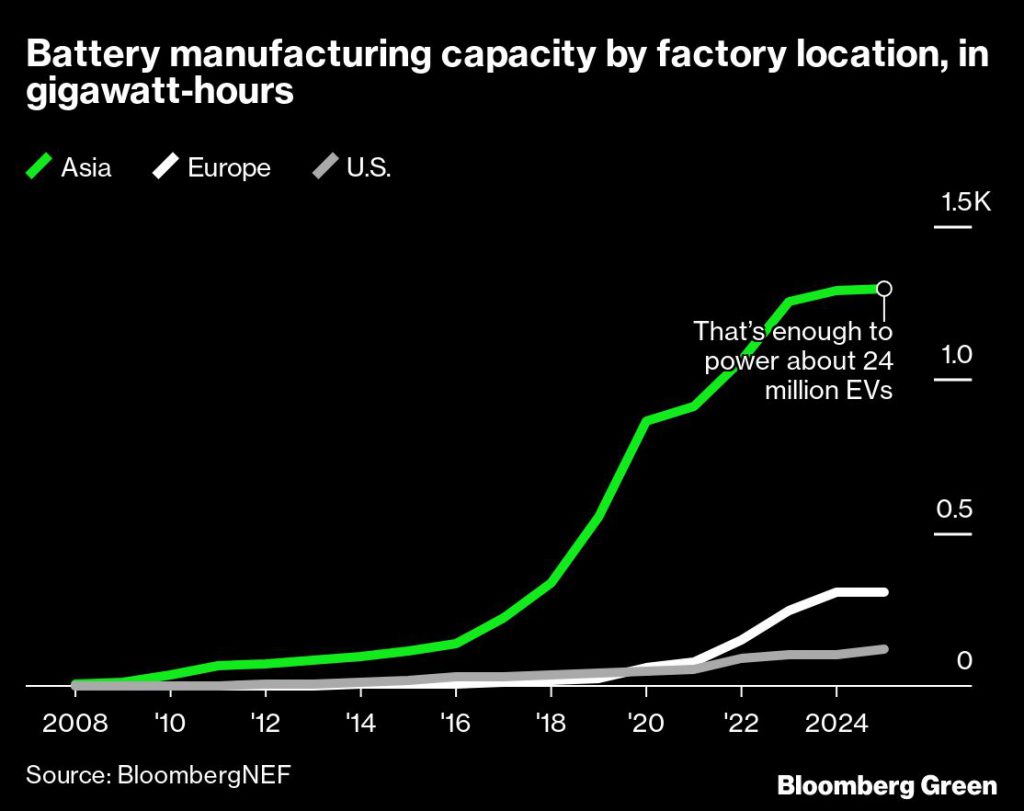 There are national security implications, too, for the U.S. and others from a battery supply chain dominated by China, a nation capable of wielding exports as a political tool. By 2025, China will have battery facilities with maximum production capacity of about 1.1 terawatt-hours’ worth of cells a year, almost double the rest of the world combined.
