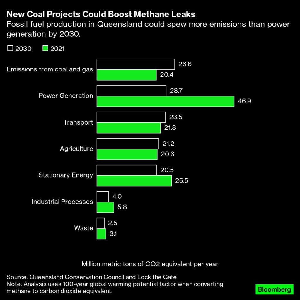Emissions from Queensland coal and gas production could reach 26.6 million metric tons of carbon dioxide equivalent a year by 2030, exceeding emissions from other sectors including the state’s power generation, the analysis from Lock the Gate and Queensland Conservation Council showed. Both groups oppose the development of new coal projects.