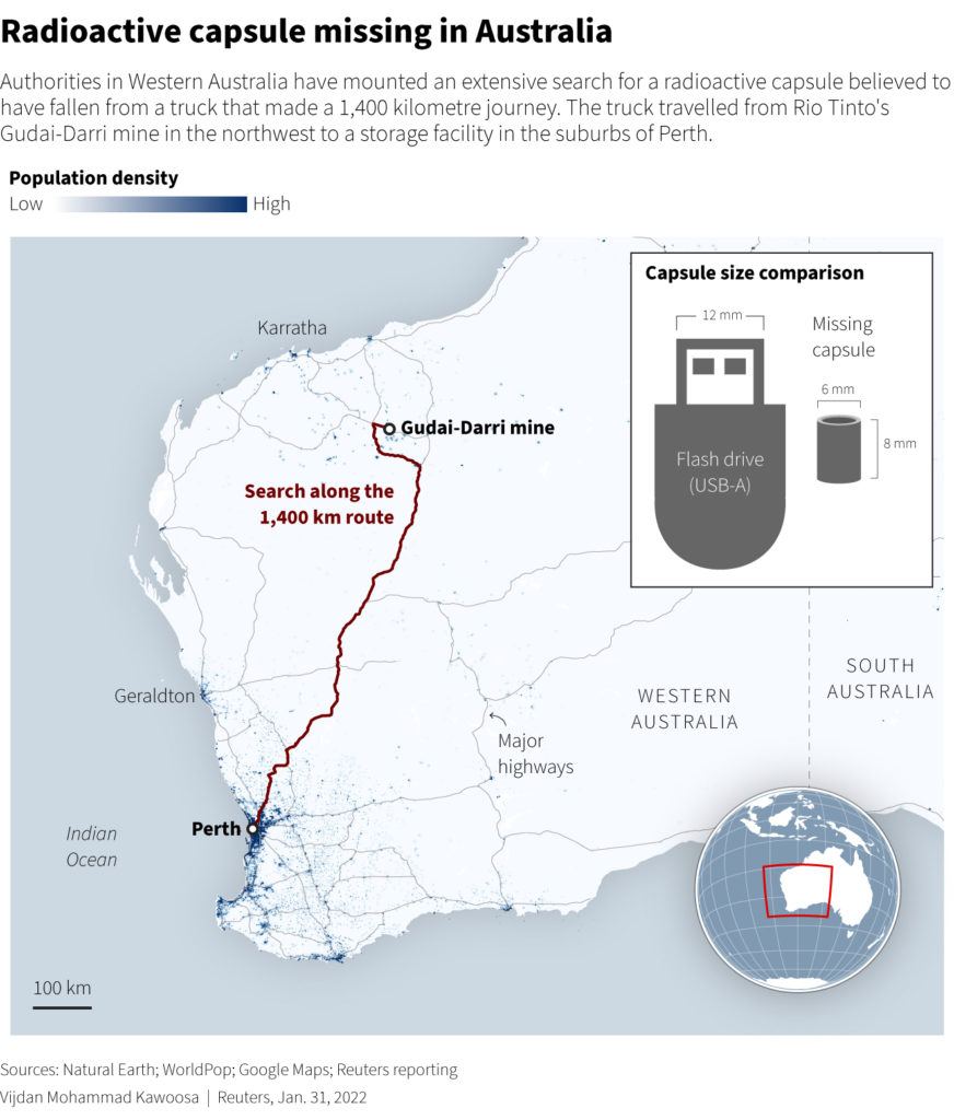 The capsule is believed to have fallen from a road train – a truck with multiple trailers – that made a 1,400 km (870 mile) journey in Western Australia and its loss has triggered a radiation alert for large parts of the vast state.