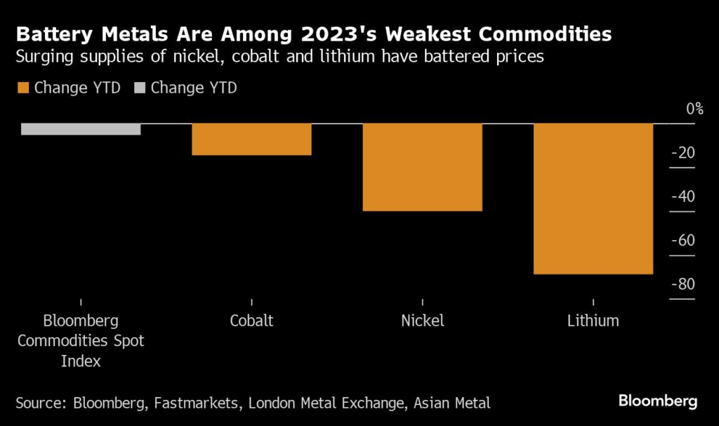 A “huge build-out” in Chinese battery capacity, aided by government policies, means supply outweighs demand by two to one, ANZ Group Holdings Ltd. analysts Daniel Hynes and Soni Kumari said in a note last week. This has seen battery markers cut output and reduce their inventories, they said, adding that lithium, nickel and cobalt prices are likely to remain depressed in the short term.