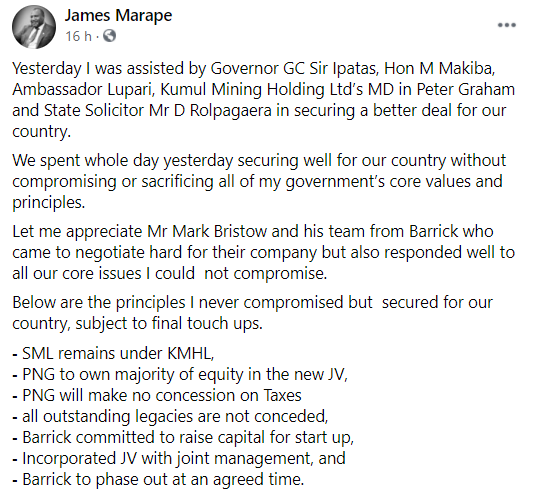 Marape has previously said the government only exercised its rights under PNG law to reclaim the lease after 30 years and that all assets at the site remained Barrick’s.