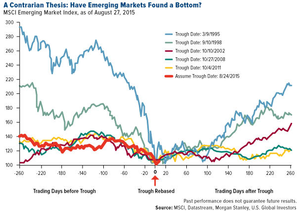 An interesting chart from Morgan Stanley suggests that emerging markets might have found a trough and are ready to turn up. Assuming that August 24, 2015 was the bottom, the bank compares the recent bear market to five previous ones and finds that it’s tracking a similar price action as 1995, 2002 and 2011. It’s also much less severe than 1998 and 2008.