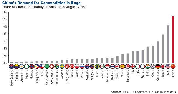 Marc was referring, of course, to China, the 800-pound commodity gorilla, as I’ve often described the country. The Asian powerhouse is currently responsible for nearly 13 percent of the world’s commodity demand, followed by the U.S. at a little over 10 percent