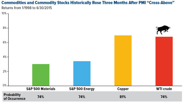 Commodities and commodity stocks historically rose three months after PMI Cross-Above graph
