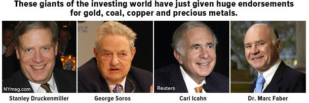 I already shared with you that famed hedge fund manager Stanley Druckenmiller made a $323-million bet on gold, now the largest position in his family office fund. It’s also come to light that George Soros recently moved $2 million into coal producers Peabody Energy and Arch Coal. Meanwhile, activist investor Carl Icahn took an 8.5-percent position in copper miner Freeport-McMoRan, which we own.