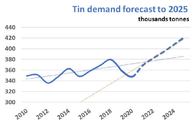 The ITA expects underlying tin demand growth to double from 2% to 4% over the next five years, potentially posing a challenge to the world’s tin producers.