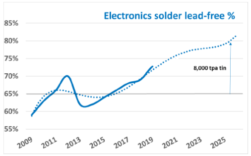 Lead-free solders averaged around 65% of the global total over the last decade, jumping to 74% last year, Pearce said.