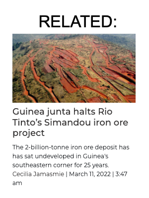 That’s partly why the Simandou deposit has remained in limbo. Interim President Mamadi Doumbouya, who seized power in a September coup, initially encouraged Rio Tinto Group and China-backed SMB Winning Consortium to work together to develop Simandou. But his government on Thursday night said operations should stop, citing a lack of progress in talks between the two parties.