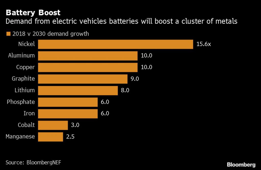 Auto companies have outlined plans to spend more than $140 billion on electric vehicle production, an industry shift that’ll need producers of specialist materials and metals for batteries to dramatically lift output. Nickel demand is forecast to surge about 16-fold through 2030 from 2018, while there will also be a significant rise in demand for graphite, lithium, copper and aluminum, according to BloombergNEF.
