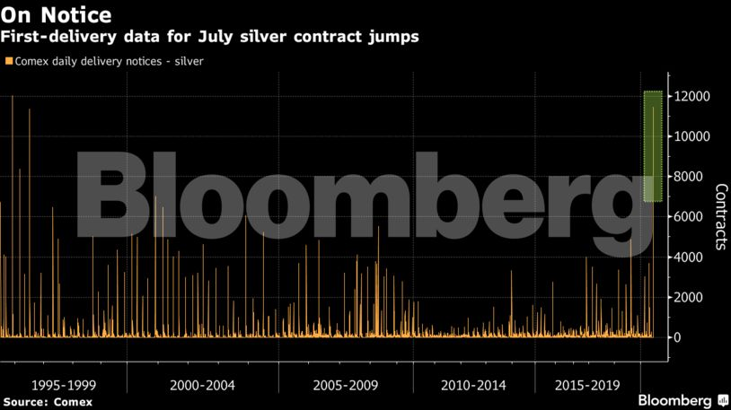 On Monday, first-notice data for the July silver contract on the Comex in New York showed the largest single day of deliveries in almost 25 years. Deliveries for platinum on the New York Mercantile Exchange were more than five times the next largest month this year.