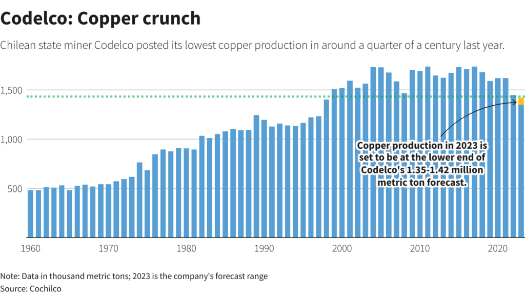 Codelco is still struggling with operational issues and a drop in grade ores, which led to its lowest production in nearly a quarter century in 2022.