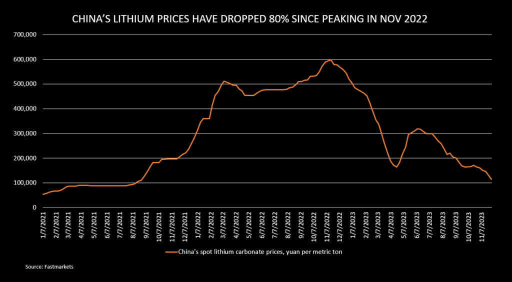 The price plunge will hit high-cost lithium producers, but offer some support to a slowing EV sector. China produces about 70% of the world’s batteries and over half of its EVs.