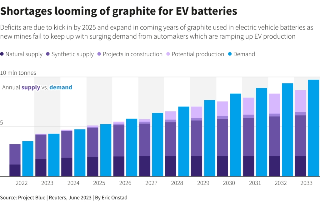 China has reduced natural graphite mining in recent years to protect the environment, instead ramping up synthetic graphite output since 2021. The synthetic form – which is produced using a byproduct of the oil refining process – now accounts for 70% of China’s output, according to Mysteel.
