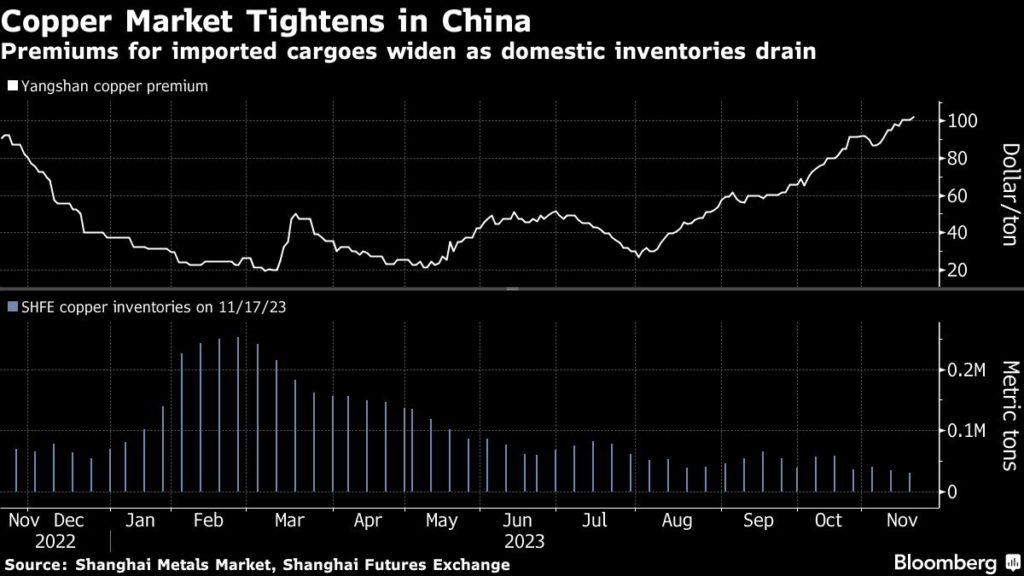 The Yangshan copper premium, or the fee traders pay for imported cargoes over benchmark prices on the London Metal Exchange, extended gains to $102.50 a metric ton, the highest level in a year, according to Shanghai Metals Market. That compares with just $27 a ton at the start of August. Premiums for domestic cargoes have also surged.