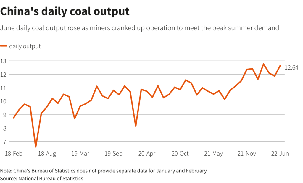 China’s daily coal output in June rose 6.6% from a month earlier as miners cranked up output ahead of peak summer temperatures, when electricity demand surges as households turn on air conditioners to keep cool.