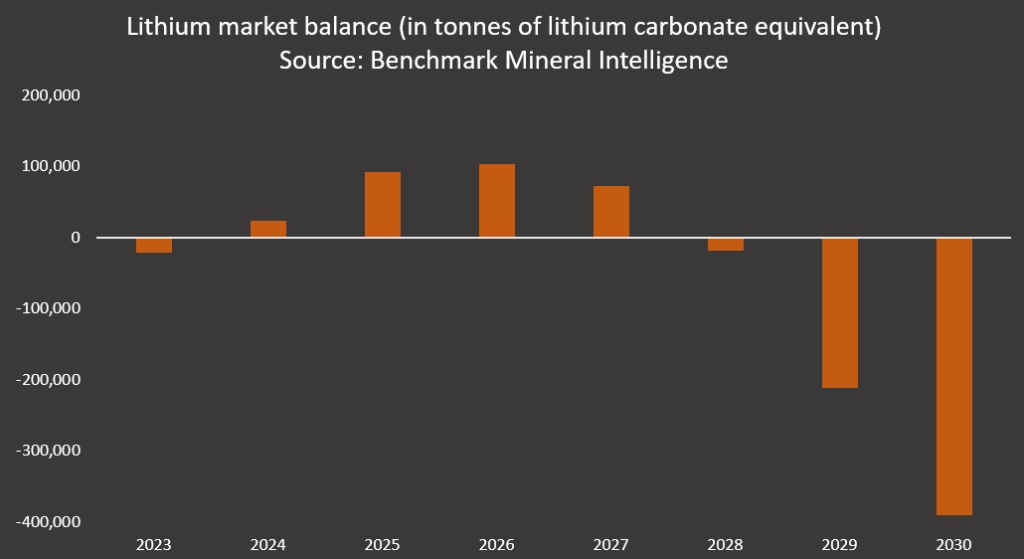 Benchmark Mineral Intelligence (BMI) expects large lithium surpluses from 2024 to 2027 before a deficit of nearly 400,000 tons of lithium carbonate equivalent appears in 2030.