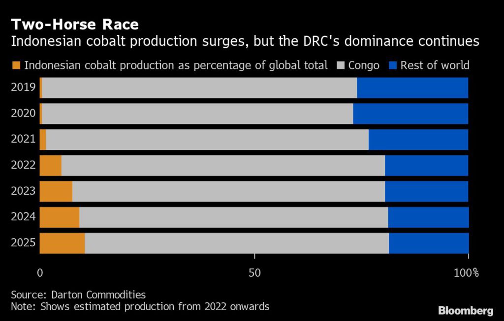 The surge in cobalt production was driven by increases in the Democratic Republic of Congo — which accounts for about 75% of global supply — as well as Indonesia, an emerging powerhouse in the small but rapidly growing market, Darton said.