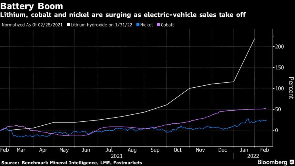 Nickel prices are also surging, adding to inflationary pressures on automakers who’ve staked their futures on electric vehicles.