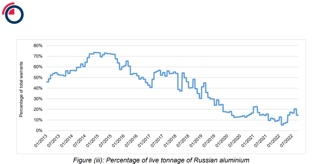 The proportion of Russian copper in LME stocks was actually higher in the third quarter of 2021, when it reached 95% of live tonnage, LME data shows.
