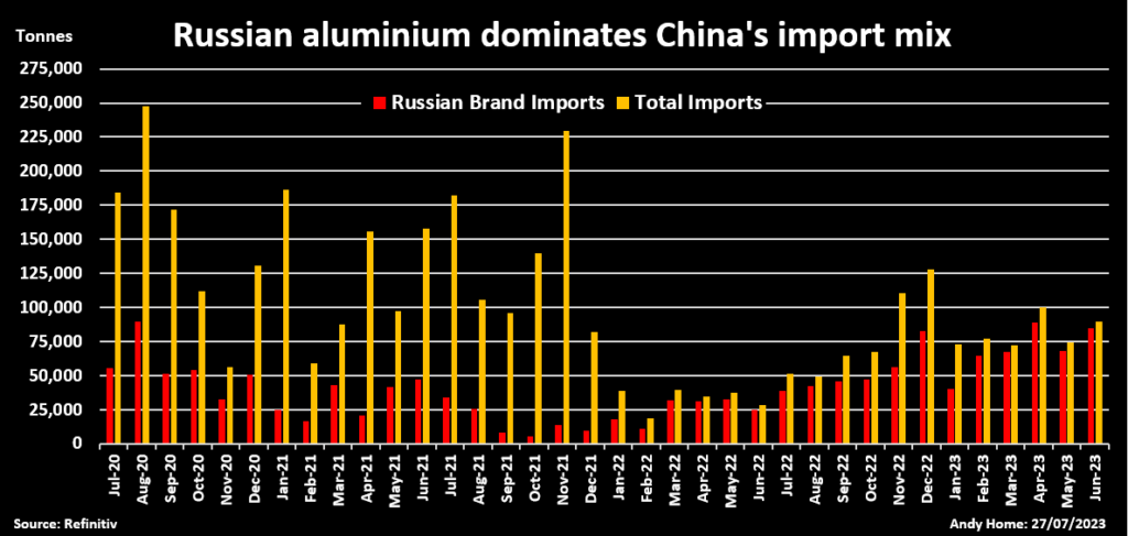 Indeed, Russian brands accounted for 85% of China’s total primary metal imports in the January-June period.