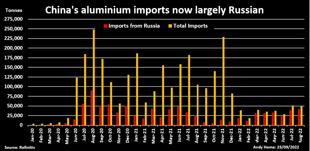 Chinese imports of primary aluminum collapsed by 77% over the first eight months of this year but those from Russia were down by only 9%. Indeed, Russian imports of 231,000 tonnes accounted for 78% of all inbound shipments.