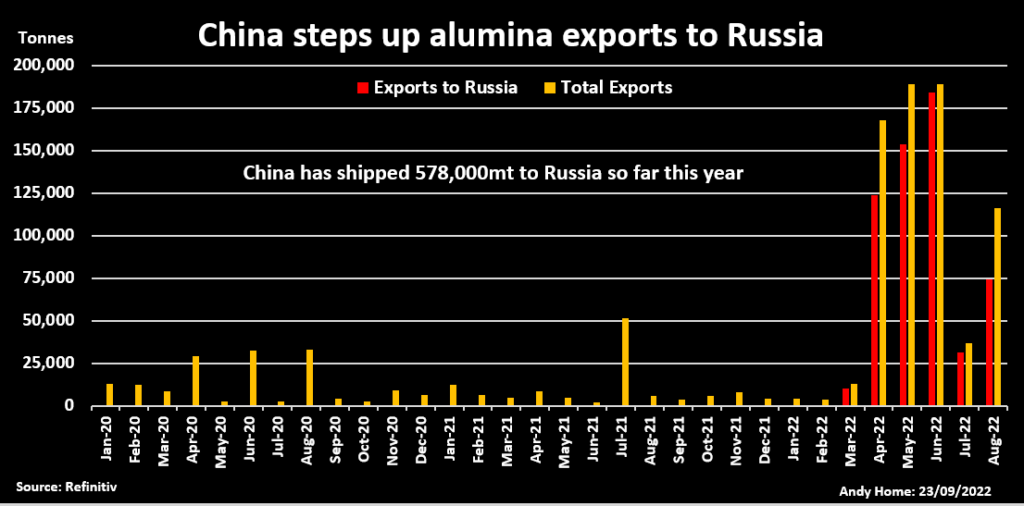 China has shipped 577,000 tonnes of alumina to Russia since March, compared with just 1,250 tonnes in 2020 and 1,750 tonnes in 2021.