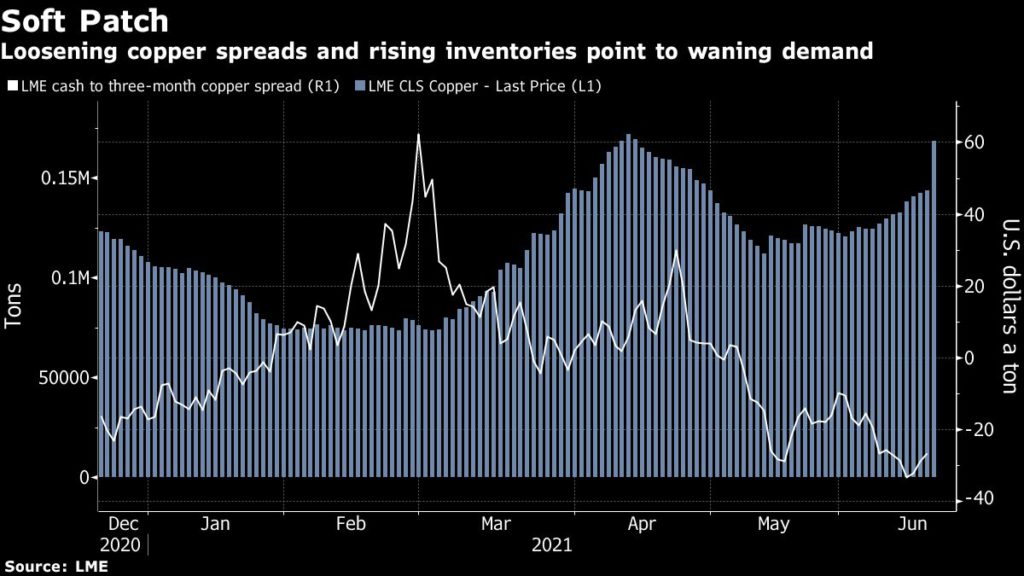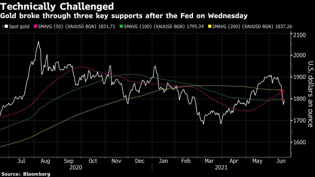Although the precious metal is often bought as a hedge against inflation, the Fed signaled this week that higher-than-expected inflation would not be allowed to persist, opening up the door for faster stimulus tapering. That weighs on the appeal of non-interest bearing gold. UBS Group AG forecasts prices at $1,600 an ounce by year-end, compared with about $1,780 now.