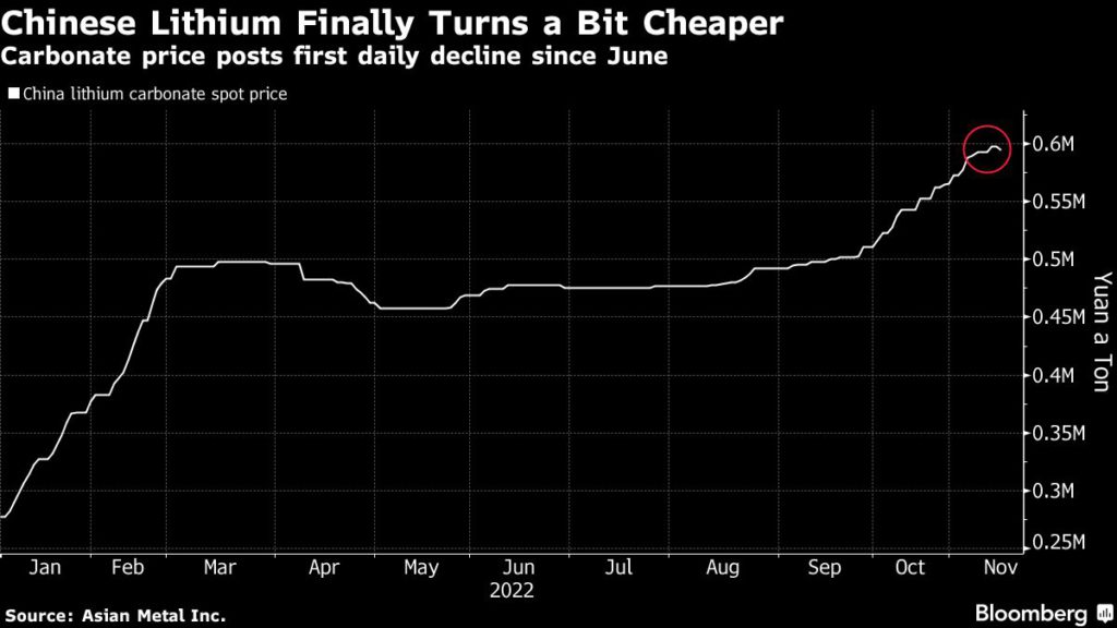 A two-year buying frenzy in the world’s biggest lithium market is showing tentative signs of cooling off into the end of 2022 as huge increases in demand from China’s electric-vehicle sector begin to moderate.